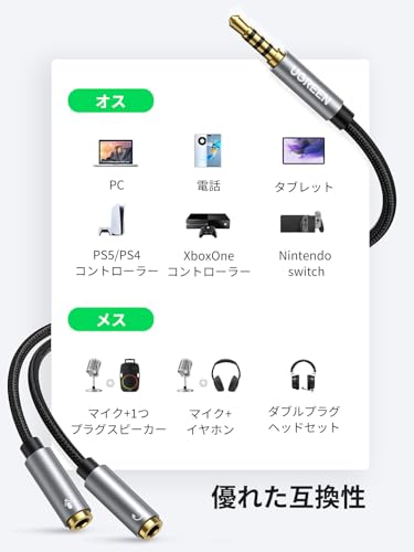 なので「3極ケーブルの片方を4極に変換するアダプター」UGREEN 3.5mm オーディオケーブル 変換ケーブルを使ったというわけです。